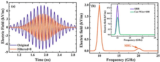 图为(a)非线性超分子的透射电场时域谱;(b)透射电场频域谱。嵌入图:两个非耦合的超原子仿真频域透射谱