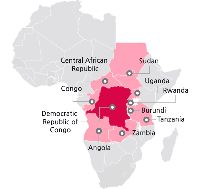 注1:刚果(金)及其周边国家包括:(a)刚果民主共和国、刚果共和国、苏丹共和国、南苏丹共和国、乌干达共和国、卢旺达共和国、布隆迪共和国、坦桑尼亚联合共和国、赞比亚共和国、安哥拉共和国、中非共和国;(b)未来包含前述国家部分或全部领域的新国家(地区)及现有国家(地区)。
