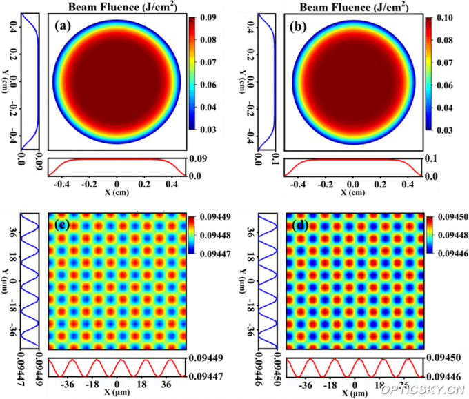 图2.新型非线性压缩方案下光通量分布图。(a)压缩前;(b)压缩后;(c)压缩前局部放大图;(d)压缩后局部放大图。