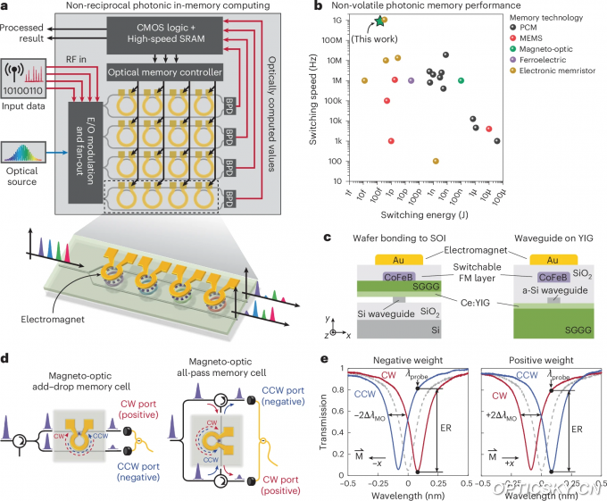 光子计算以其高速度和低能耗的优势成为人工智能和机器学习领域未来发展的重要方向之一。然而,目前的光子处理架构面临着存储阵列更新速度慢、能耗高以及耐久性不足等挑战。该研究团队提出的非互易磁光技术,通过将掺铈钇铁石榴石与硅微环谐振器集成,成功解决了这些瓶颈。利用这种材料的非互易相移特性,研究人员展示了光子内存单元的快速编程(1纳秒)、低能耗(每比特143飞焦耳)以及出色的耐久性(可编程24亿次循环)。
