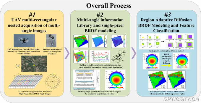 针对上述问题,中科院西安光机所副研究员李海巍团队联合研究员王爽,首创无人机多矩形嵌套飞行方案,并基于多角度影像计算了研究区域单像素类别、坡度、坡向等属性,构建了多角度信息库。研究人员利用该信息库,对Hapke、Kernel、RPV模型进行适应性改进,将建模尺度精确到单个厘米级像素。进一步,研究提出自适应扩散理论,并结合自适应感知扩散窗口,将单个像素建模结果扩散到最大最优观测区域,实现高精度建模。基于此,高精度模型的地物分类精度从91.65%提升至97.23%。