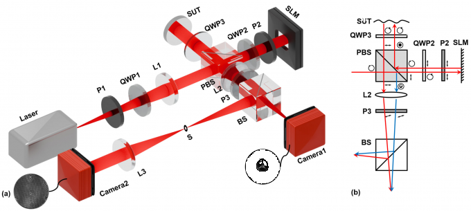 (P1-3:线偏振片,QWP1-3:四分之一波片,L1-3:透镜,PBS:偏振分光器,BS:分光器,SUT:待测面,S:光阑)