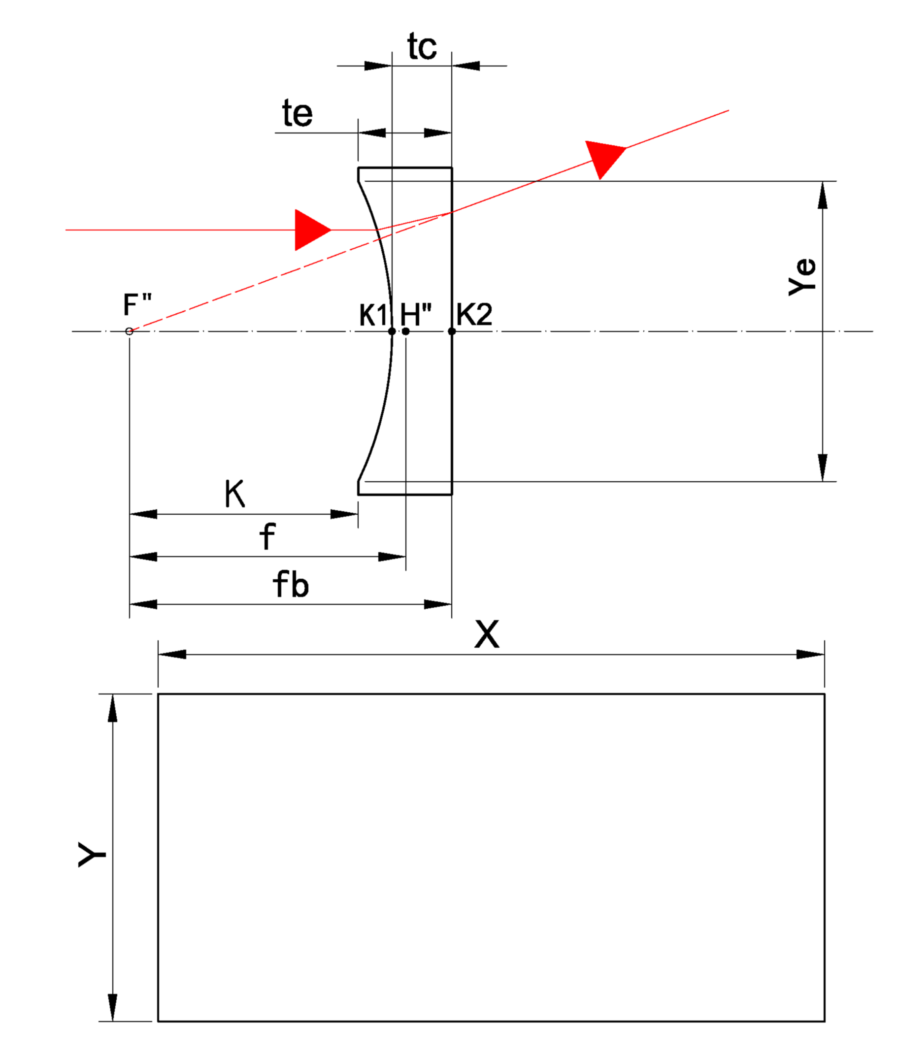 平凹柱面透镜与平凹球面透镜作用类似,但平凹柱面透镜只在一个轴上起作用。这些柱面透镜用于那些需要在一维方向对点光源整形的应用。典型应用的是利用单个柱面透镜将准直的激光束转换为线光束,一对柱面透镜可以用来对图像进行整形,为了最小化球差,当对光束进行发散时,光线应从透镜的曲面入射。