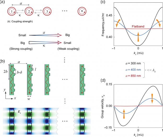 山东师范大学与澳大利亚国立大学的科学家在《先进光子学》发表的研究中取得了突破。他们创新性地将耦合谐振光波导(CROW) 原理与各向异性平面结构相结合,设计出新型超表面。通过弱连接的光波导阵列与故意打破对称性的设计,在保持超高品质因数的同时实现了广角光子平带。波导间精确调控的横向耦合使光速降至近零群速度,显著增强了光物相互作用并确保不同入射角下的稳定共振。